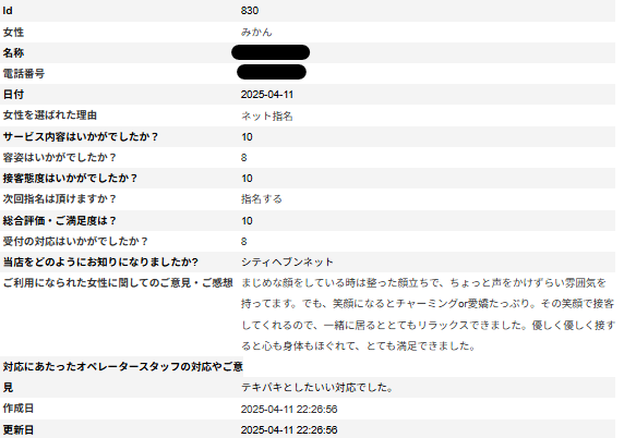 みかんさんお客様からのアンケート 2025年04月13日 S様この度はご利用ありがとうございます。また貴重なご意見ありがとうございます。みかんさんと楽しんで頂けて良かったです。みかんさんもアンケートを見て喜んで頂いている事と思います。今後ともどうぞ宜しくお願い致します。 < 前の記事次の記事 > コメント コメントフォーム 名前 コメント 記事の評価 リセット リセット 顔 星 情報を記憶 コメントを投稿する