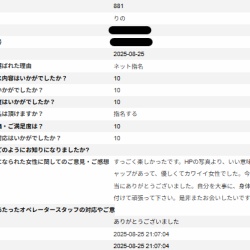 S様いつもご利用ありがとうございます。また貴重なご意見ありがとうございます。りのさんお客様からのアンケートりのさんと楽しんで頂けて良かったです。お褒めのお言葉ありがとうございます(*^▽^*)りのさんもアンケートを見て喜んで頂いている事と思います。当店は、実技 ...